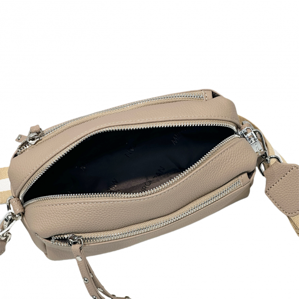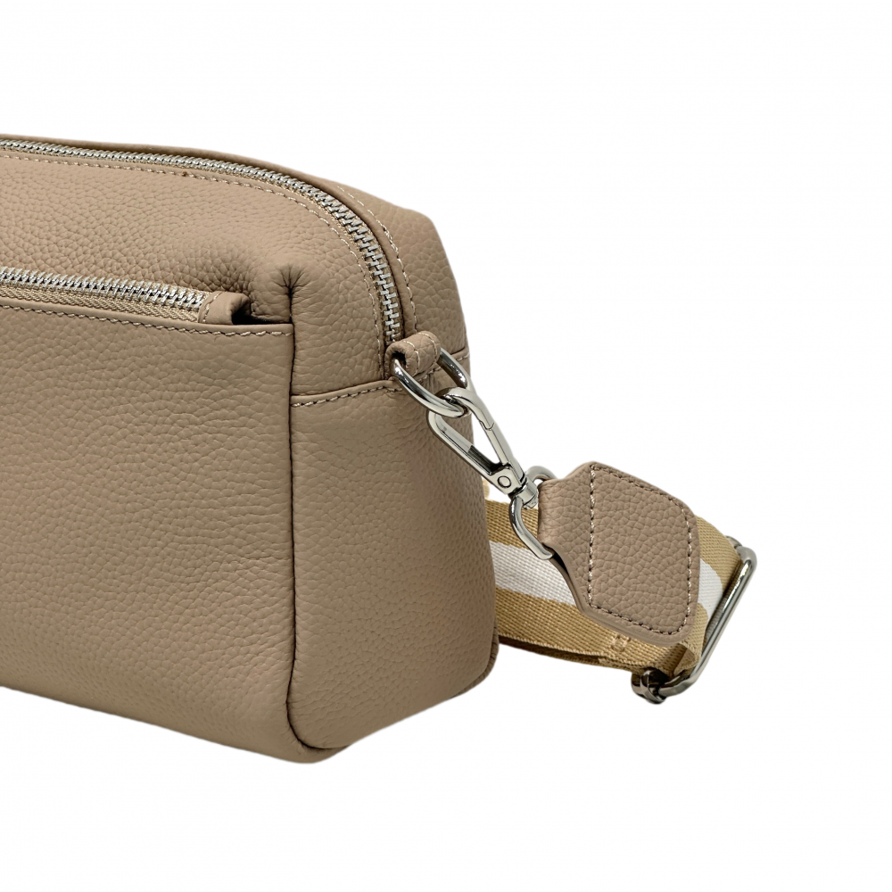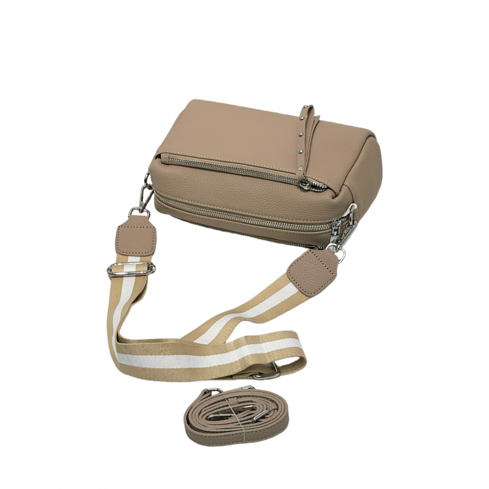 Вместительная сумка кросс-боди MIRONPAN выполнена из натуральной зернистой кожи в бежевом оттенке. Модель отличает лаконичный дизайн и продуманная система хранения. Основное отделение закрывается на молнию. Внутри карман на молнии и открытый . На лицевой и тыльной стороне расположены вместительные карманы быстрого доступа закрываются на молнии. В комплекте два съёмных плечевых ремня : один кожаный - шириной 1 см, другой текстильный -шириной 4 см , ремни регулируется по длине. Размер 22 х 12 х 9 см.