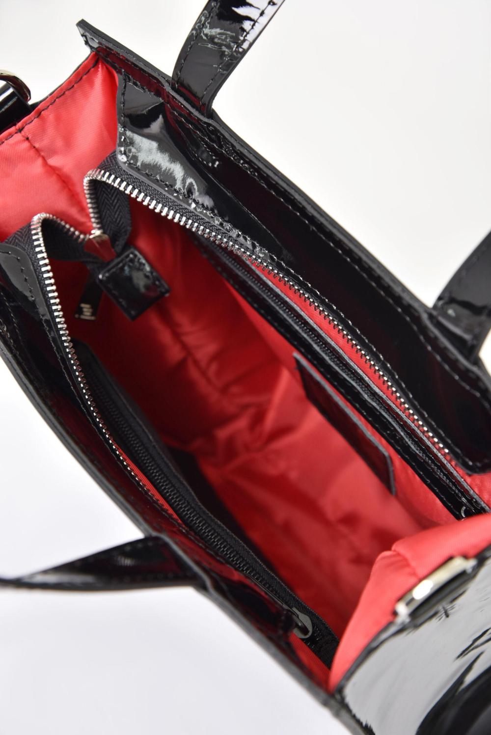 Сумка женская со съемным регулируемым ремнем через плечо, застегивается на молнию и имеет одно отделение. На задней стенке расположен карман на молнии. Сумка на подкладке красного цвета. Внутри сумка имеет карман на молнии и карман накладной карман на молнии "карман в кармане" из плотного материала. Металлические ножки для защиты дна сумки. Размер 24,5х28х9,5 см. Ремень плечевой 85-122 см. Россия.